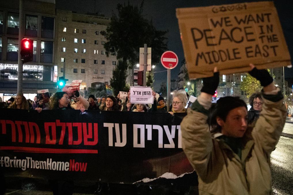 1月24日,人們在耶路撒冷街頭參加游行。當日,部分民眾在耶路撒冷舉行游行,呼吁以色列政府在加沙?;鹬箲?,并盡快采取措施讓被扣押在加沙地帶人員獲得釋放。新華社記者陳君清攝
