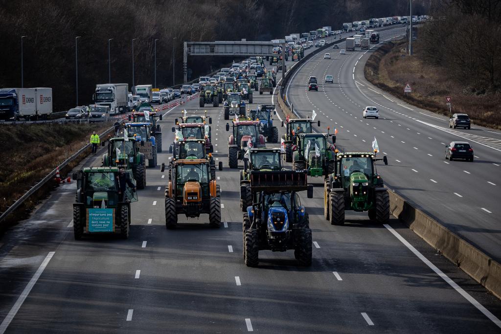 1月29日,在法國巴黎附近的隆維利耶,農業生產者用拖拉機封堵通往巴黎的高速公路。新華社發(奧雷利安·莫里薩爾攝)