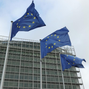 圖為2023年11月15日拍攝的比利時布魯塞爾歐盟委員會總部大廈外歐盟旗幟的資料照片。新華社記者 趙丁喆 攝