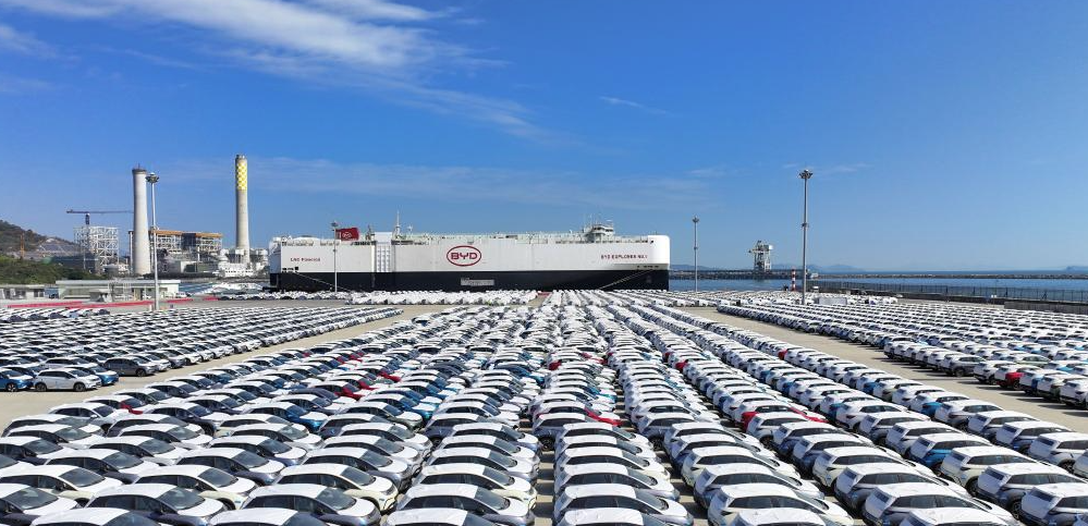 1月14日,“BYD EXPLORER NO.1”(比亞迪“開拓者1號”)滾裝船抵達深圳港小漠國際物流港。1月15日,搭載5000多臺新能源車的比亞迪“開拓者1號”滾裝船舉行首航儀式,駛往歐洲的符利辛根港和不來梅哈芬港。(新華社發)