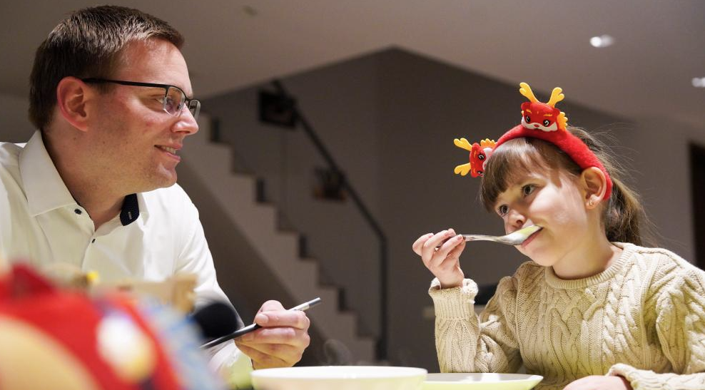 2月23日,薩沙(左)與尤莉亞在家中品嘗湯圓。來自德國的奧迪一汽新能源汽車有限公司的工程師薩沙和妻子約翰娜帶著女兒尤莉亞在中國慶祝元宵節。新華社記者顏麟蘊攝