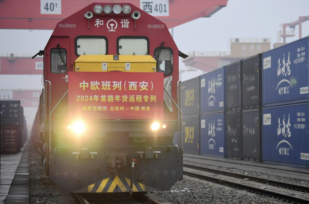2月1日,滿載來自哈薩克斯坦1740噸菜籽油原油的X8010次中歐班列抵達西安國際港站。新華社記者李一博攝