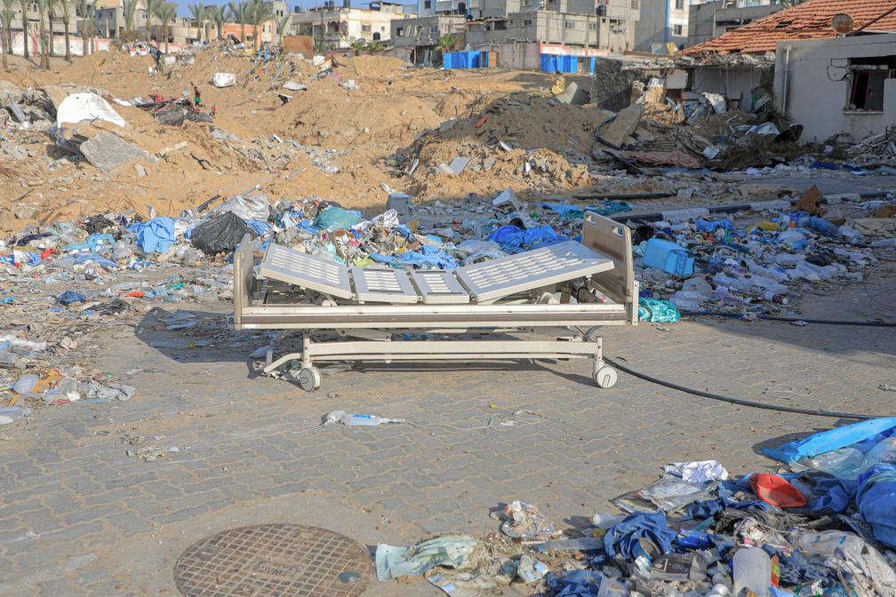 這是2月28日在加沙地帶南部城市汗尤尼斯納賽爾醫院內拍攝的病床。納賽爾醫院是加沙地帶南部最大醫院。新華社發(里澤克·阿卜杜勒賈瓦德攝)
