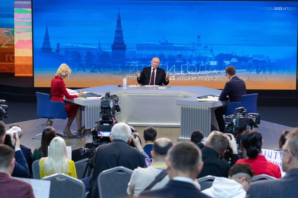 2023年12月14日,俄羅斯莫斯科,俄總統普京在“年度盤點”活動上講話。新華社記者曹陽攝