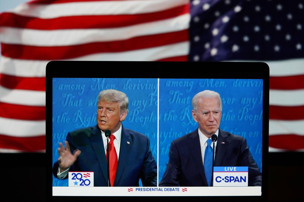 這張2020年10月22日在美國弗吉尼亞州阿靈頓拍攝的視頻畫面顯示,時任美國總統特朗普(左)與當時的民主黨總統候選人拜登在田納西州納什維爾市參加最后一場總統候選人電視辯論。新華社記者 劉杰 攝