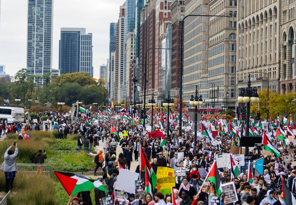 2023年10月21日,在美國芝加哥,人們參加聲援巴勒斯坦的游行。新華社發(文森特·約翰遜攝)