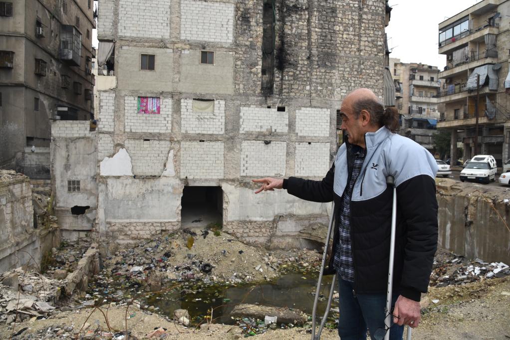 1月26日,在敘利亞阿勒頗,當地居民葉海亞·卡克赫站在被地震毀壞的家前。2023年2月6日,土耳其南部靠近敘利亞邊境地區發生7.7級強烈地震,在土造成逾5萬人喪生,在敘造成數千人死亡。新華社發(蒙塞夫攝)
