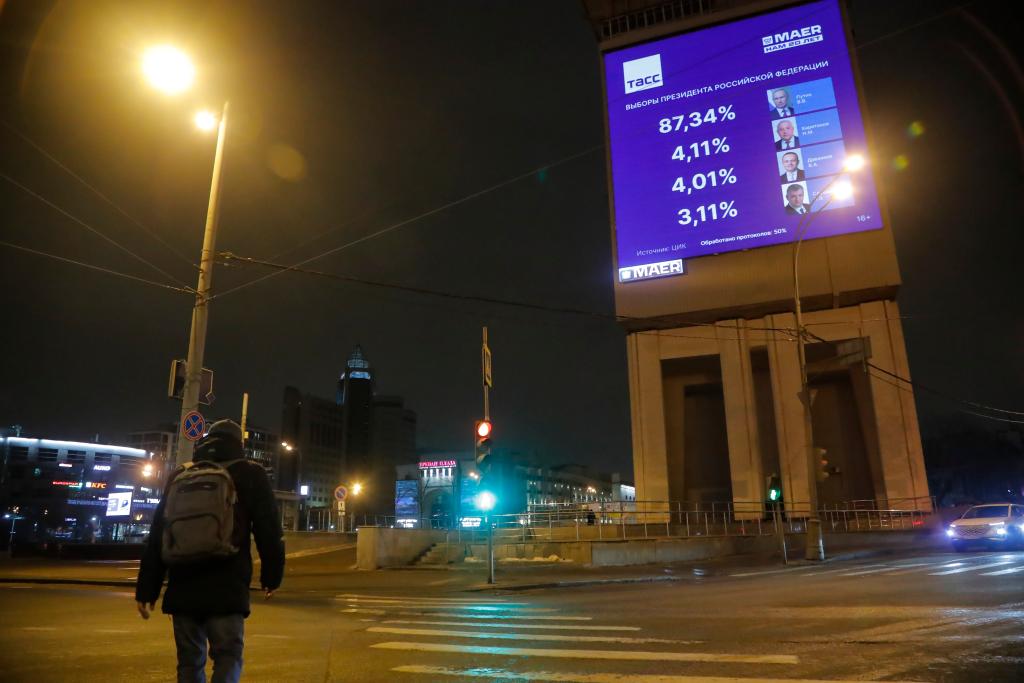 這是3月17日在俄羅斯首都莫斯科街頭拍攝的屏幕上的總統選舉實時統計數據。新華社發(亞歷山大攝)