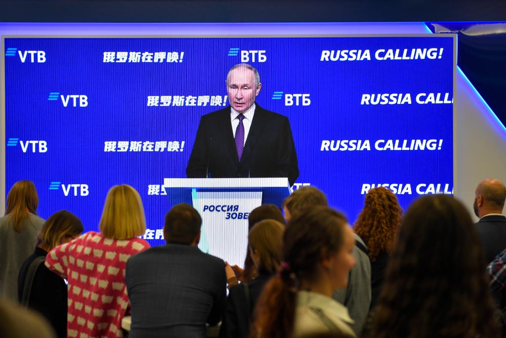 這是2023年12月7日拍攝的俄羅斯總統普京在莫斯科出席第十四屆“俄羅斯在呼喚”論壇的視頻畫面。普京當日在論壇上表示,全球經濟體系正在發生“根本性的、不可逆轉的”變化,俄羅斯希望建立一種所有參與者真正公平競爭的世界經濟發展模式。新華社發(亞歷山大攝)