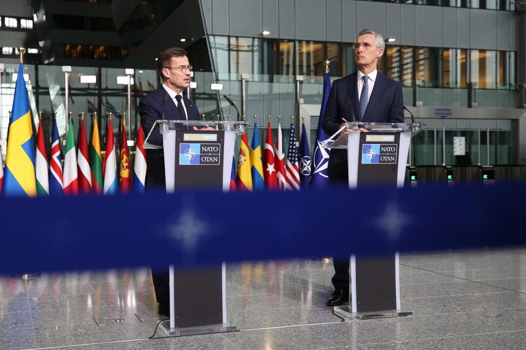 3月11日,在位于比利時布魯塞爾的北約總部,瑞典首相克里斯特松(左)和北約秘書長斯托爾滕貝格出席聯合新聞發布會。北約當日在其總部舉行瑞典加入北約儀式。瑞典成為北約第32個成員國。新華社記者趙丁喆攝