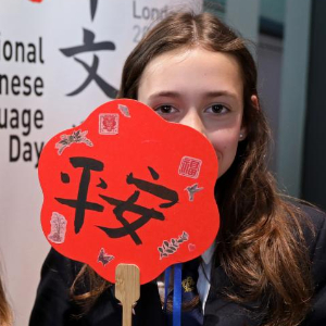2023年5月11日,在英國倫敦,學生在2023“國際中文日”英國主題活動上展示自己的書法。新華社記者李穎攝