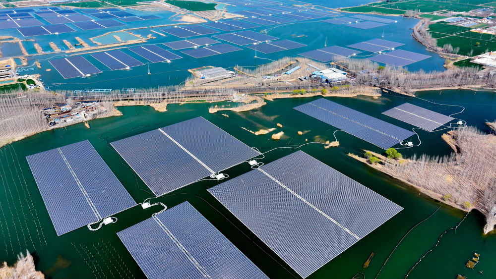 這是山東省濟寧市微山縣驩城鎮利用采煤塌陷區約3600畝水面建設的漁光互補項目(2024年3月20日攝,無人機照片)。該項目集光伏發電、漁業養殖、生態修復于一體。新華社記者 郭緒雷 攝