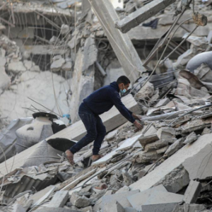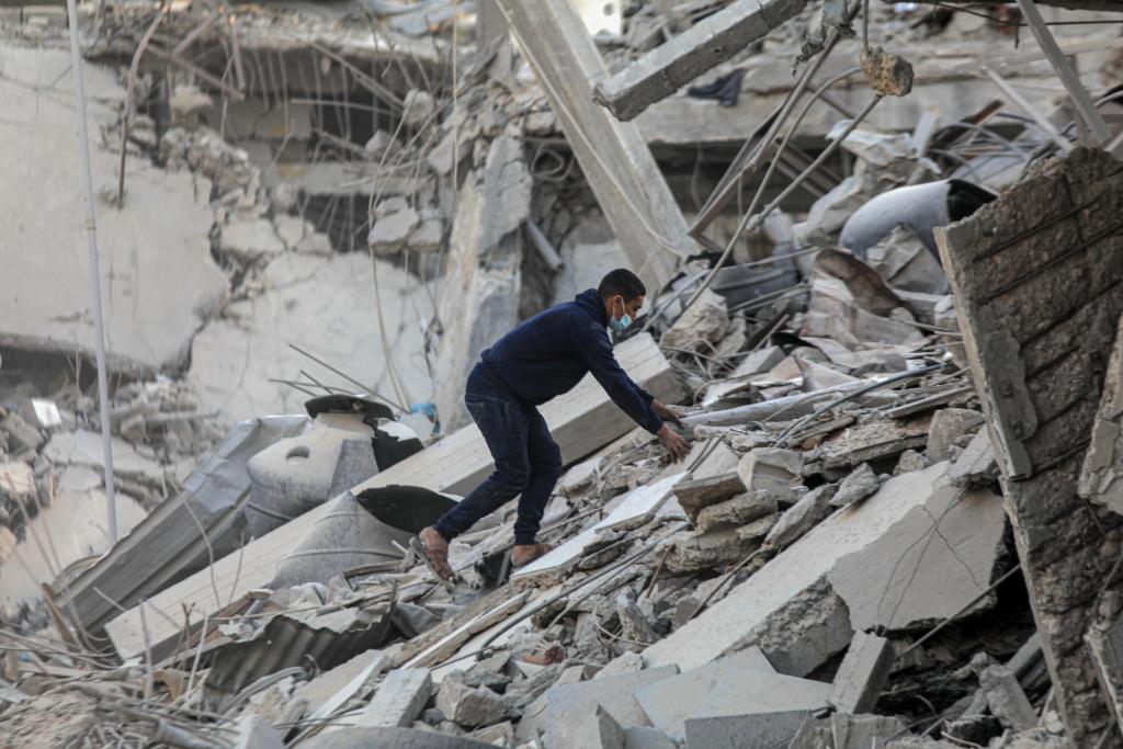 3月6日,在加沙地帶南部城市汗尤尼斯,一名男子清理建筑廢墟。新華社發(里澤克·阿卜杜勒賈瓦德攝)