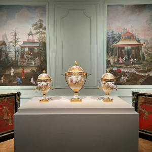 展廳正中,復刻路易十五王后瑪麗·萊什琴斯卡私人房間“中國人廳”的展陳精致非常。繪制中國人物形象的法國產瓷瓶、鑲嵌了中國漆版的墻角柜,正無聲訴說著當年法國貴族們對中國藝術的追捧和熱愛。