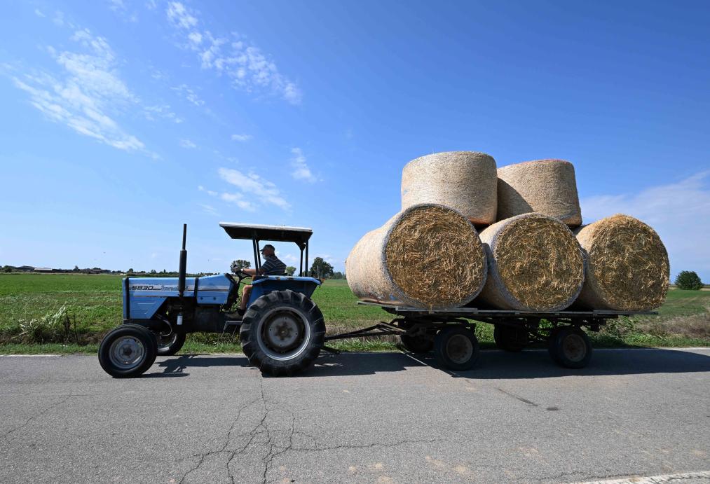 2022年8月12日,在意大利倫巴第大區曼托瓦,農民運送草垛。新華社發(阿爾貝托·林格里亞攝)