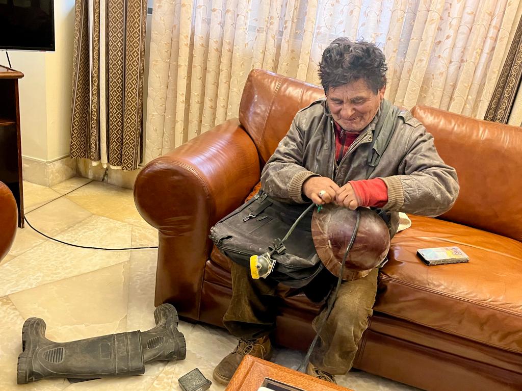 2023年12月13日,退休礦工胡利奧·雷耶斯在接受采訪時向記者展示他使用過的礦燈、礦帽和礦靴。新華社記者王林園攝