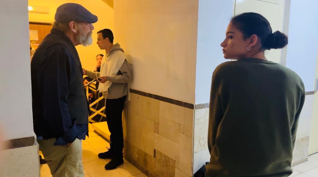爆炸聲中,樓道里傳來一片喧嘩,夾雜著嬰兒的陣陣哭聲,原來鄰居們已在防空警報響起的那一刻走出家門避難。人人眉頭緊鎖、神情緊張。