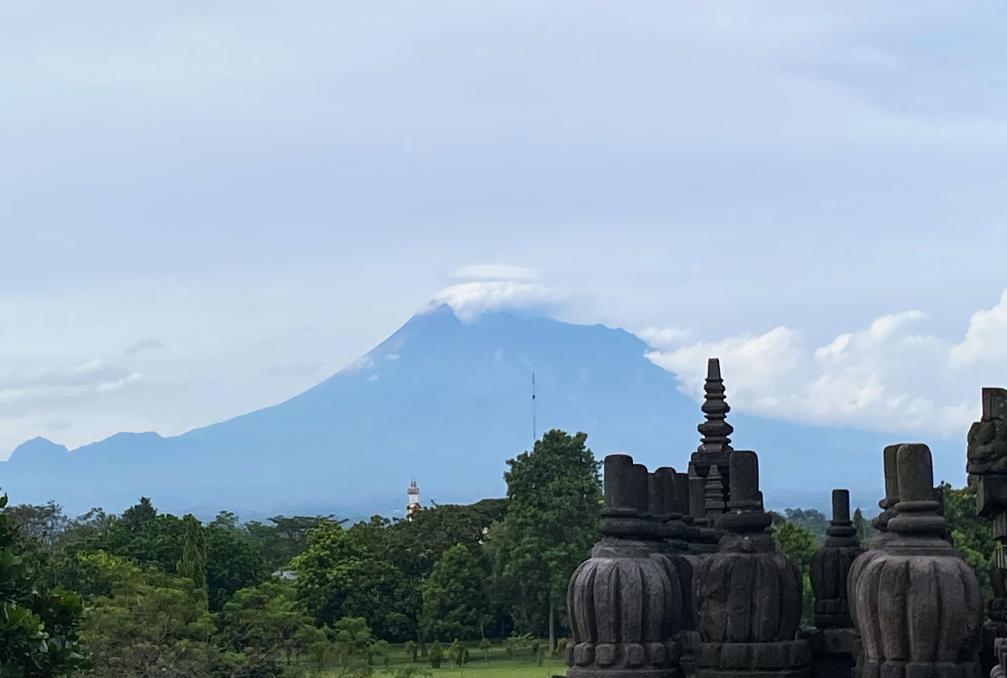 圖為2023年2月4日在印度尼西亞日惹特區拍攝的巴蘭班南神廟一角和遠處的默拉皮火山。新華社記者徐欽攝