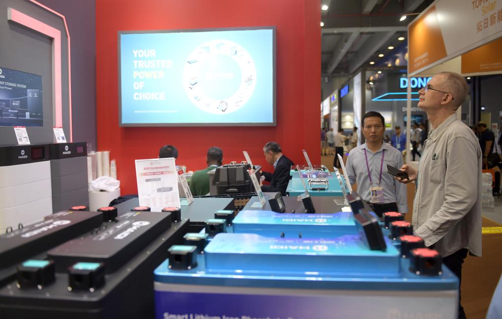 4月16日,采購商在第135屆廣交會上了解儲能設備。電動載人汽車(新能源汽車)、鋰電池和太陽能電池被稱為我國外貿“新三樣”?!靶氯龢印鳖I跑出口,激發外貿新動能,推進中國經濟高質量發展。本屆廣交會上,“新三樣”相關展區“光電鋰”交易持續火爆。新華社記者盧漢欣攝