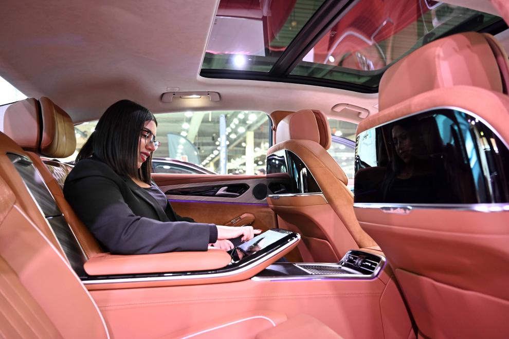 2月7日,在科威特哈瓦利省舉行的車展上,一名女子體驗紅旗展車。新華社發(阿薩德攝)
