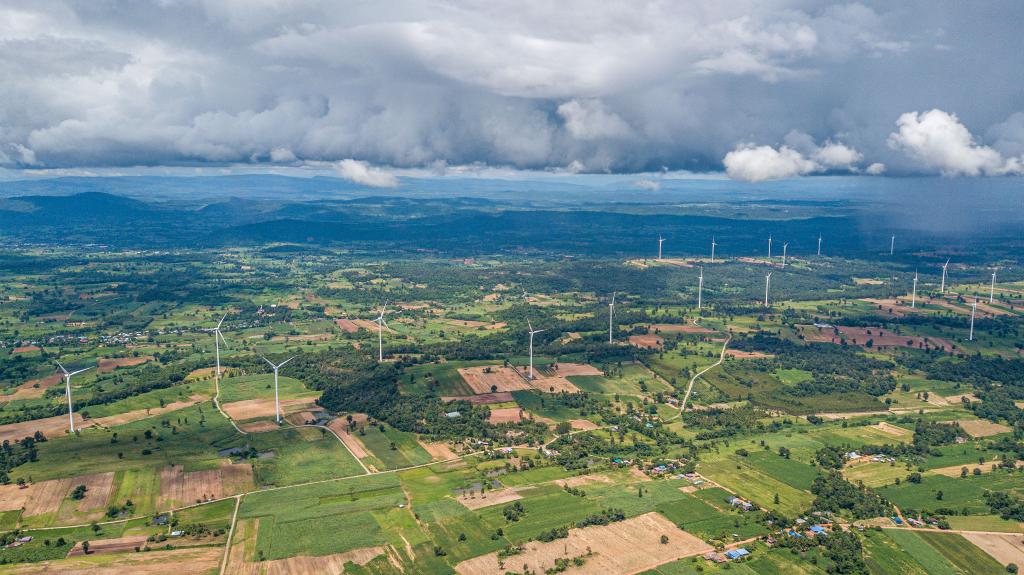 這是2023年10月5日在泰國猜也蓬府拍攝的由中國金風科技提供的風力發電機(無人機照片)。新華社記者王騰攝