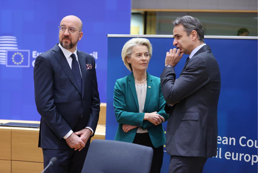 4月18日,在比利時布魯塞爾,歐洲理事會主席米歇爾、歐盟委員會主席馮德萊恩和希臘總理米佐塔基斯(從左至右)在出席歐盟特別峰會期間交談。新華社記者趙丁喆攝