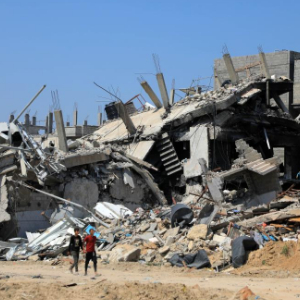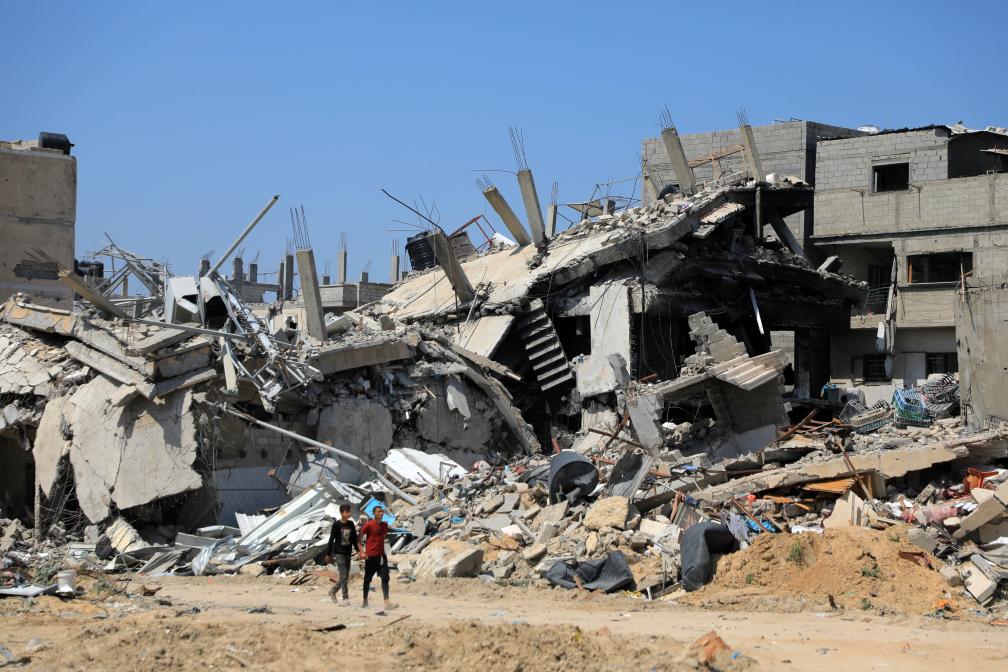 4月16日,在加沙地帶南部城市汗尤尼斯,人們走過損毀的建筑。新華社發(里澤克·阿卜杜勒賈瓦德攝)