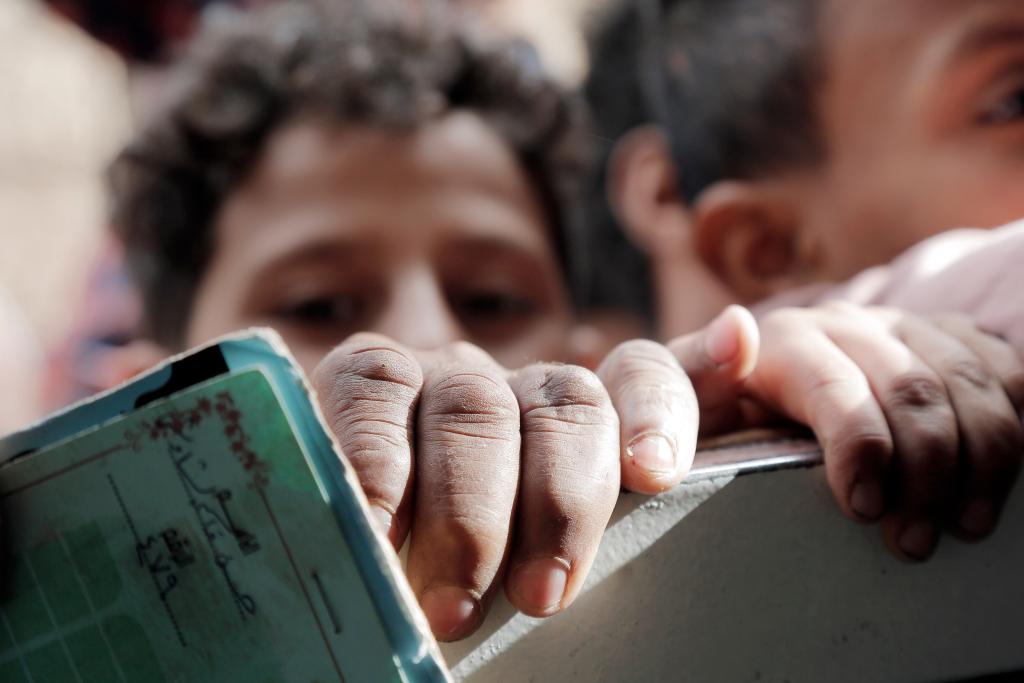 3月26日,也門民眾在首都薩那的一處救濟中心排隊領取免費的食物。新華社發(默罕默德攝)