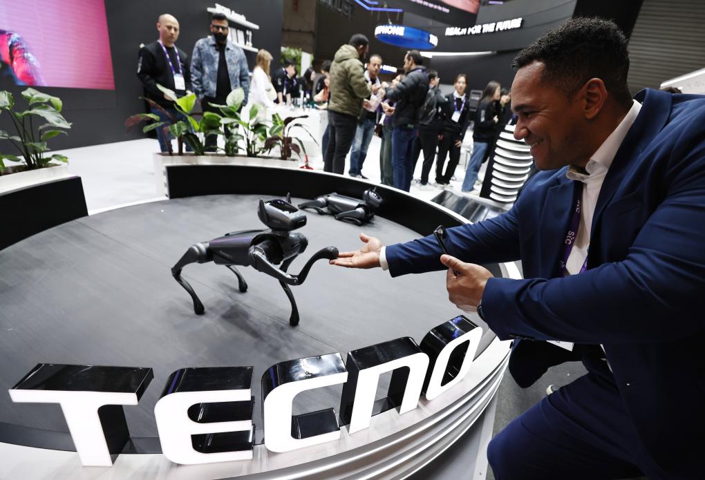 2月26日,在西班牙巴塞羅那舉行的2024年世界移動通信大會上,人們參觀傳音旗下的TECNO展臺。新華社記者高靜攝