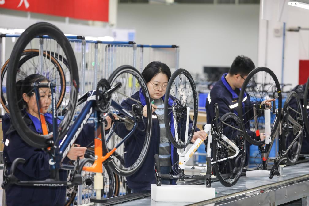 2月19日,工人在山東省樂陵市經濟開發區一民營企業生產自行車。新華社發(賈鵬攝)