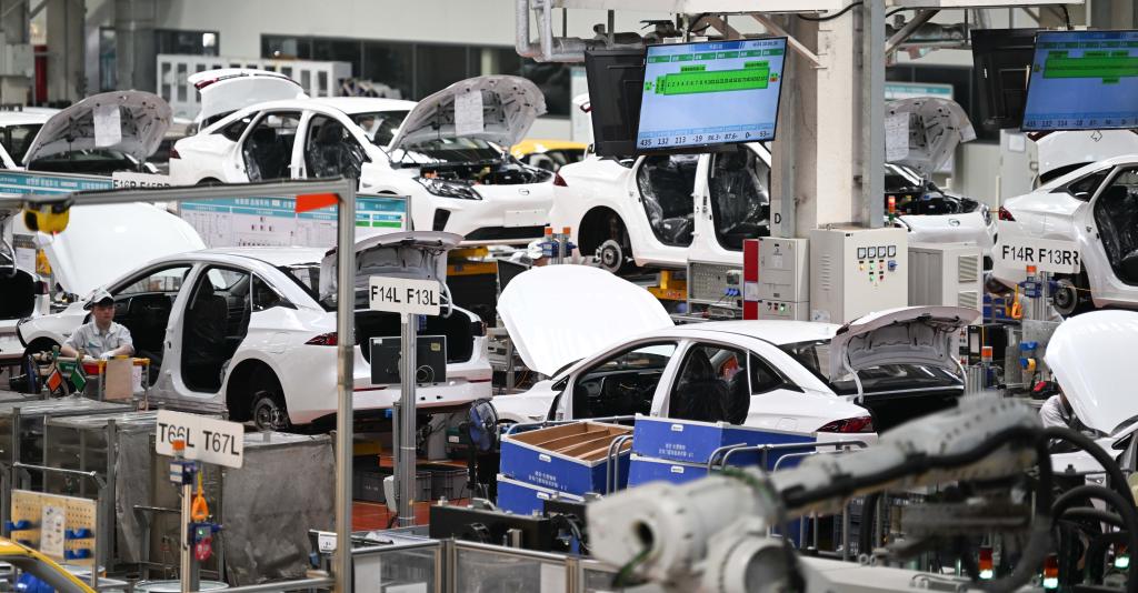 這是4月24日拍攝的廣州廣汽埃安新能源汽車總裝車間生產線。新華社記者鄧華攝