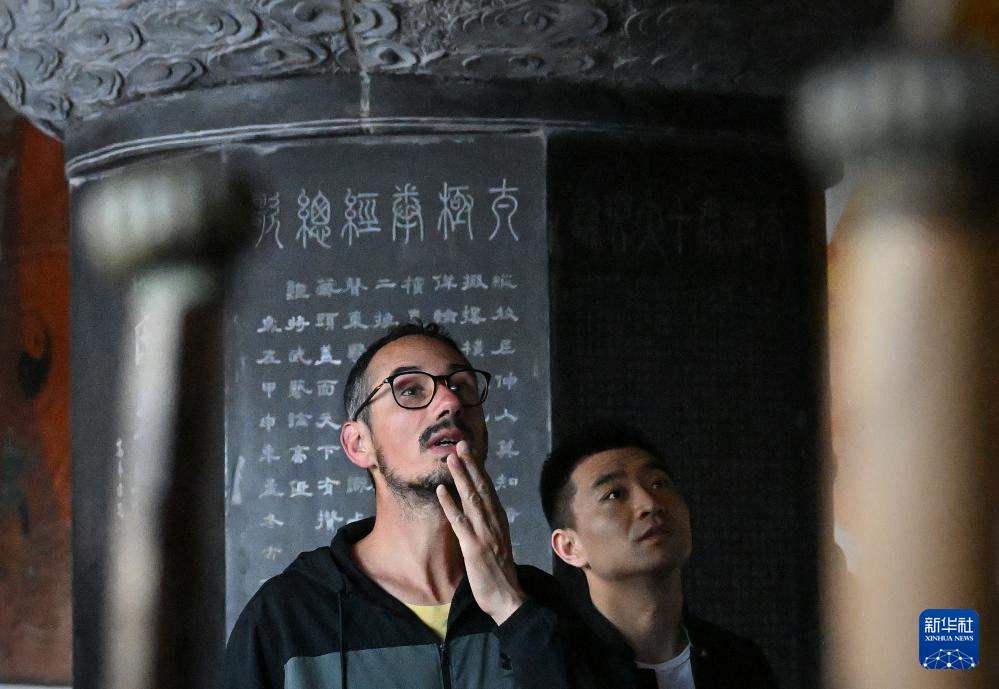 陳少拳(左)在陳家溝太極拳祖祠內參觀(2024年4月19日攝)。 新華社記者 李安 攝