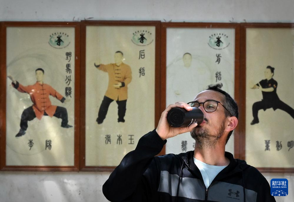 在陳家溝太極拳學校,陳少拳在練拳間隙喝水(2024年4月18日攝)。 新華社記者 李安 攝