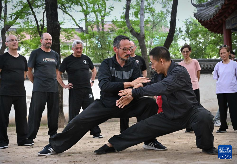 陳少拳(前左)和師父陳自強(前右)以及來自法國的學員們在陳家溝楊露禪學拳處練習太極拳(2024年4月18日攝)。 新華社記者 李安 攝