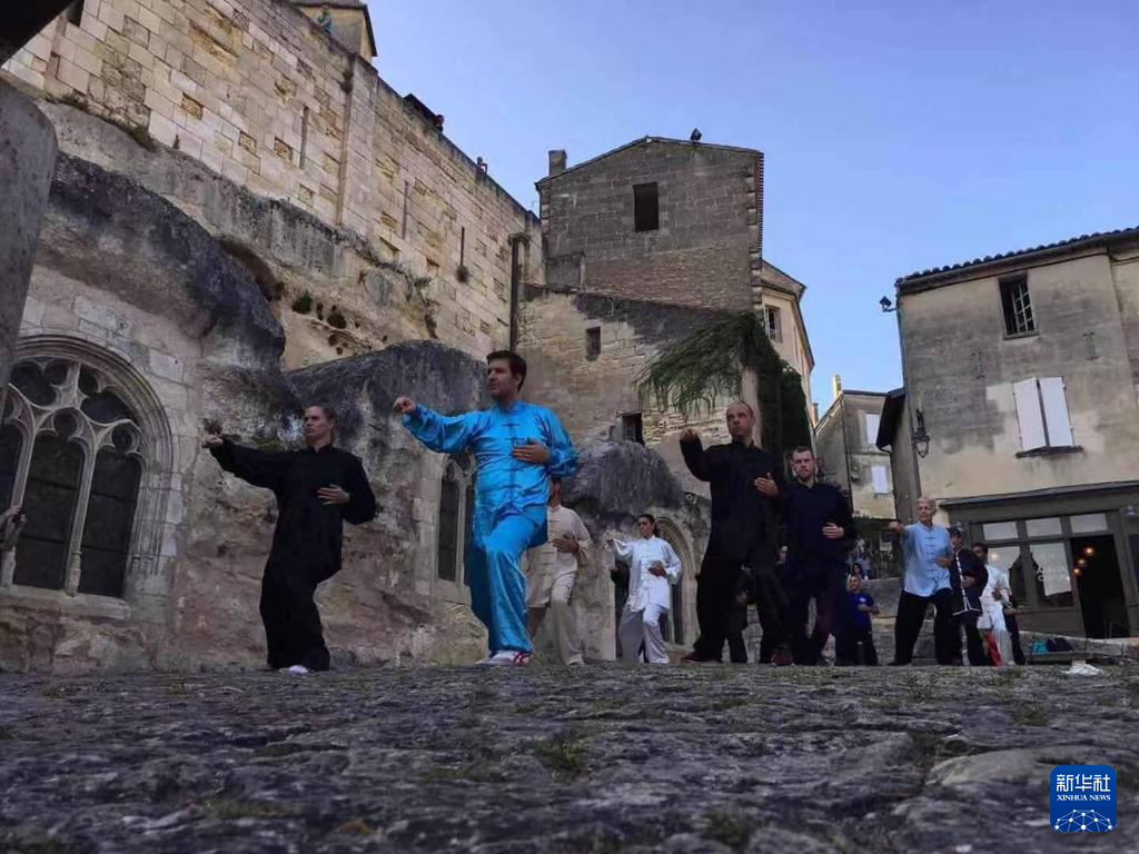 法國學員在法國圣埃美隆獨石教堂廣場練習太極拳(2019年拍攝)。 新華社發(受訪者供圖)