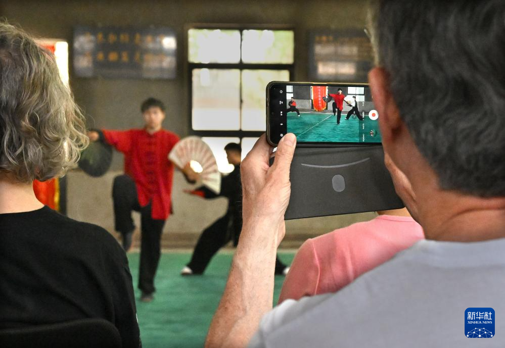 法國學員在陳家溝太極拳學校拍攝學生進行的太極扇表演(2024年4月18日攝)。 新華社記者 李安 攝