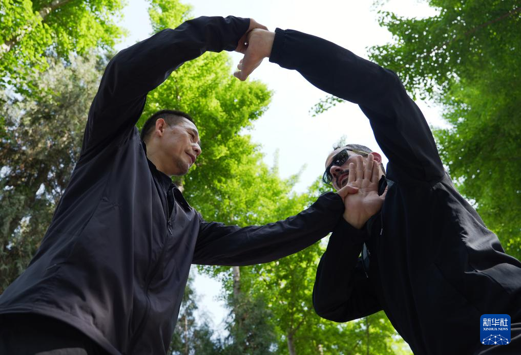 陳少拳(前左)和師父陳自強(前右)在陳家溝楊露禪學拳處交流太極推手(2024年4月18日攝)。 新華社記者 李安 攝