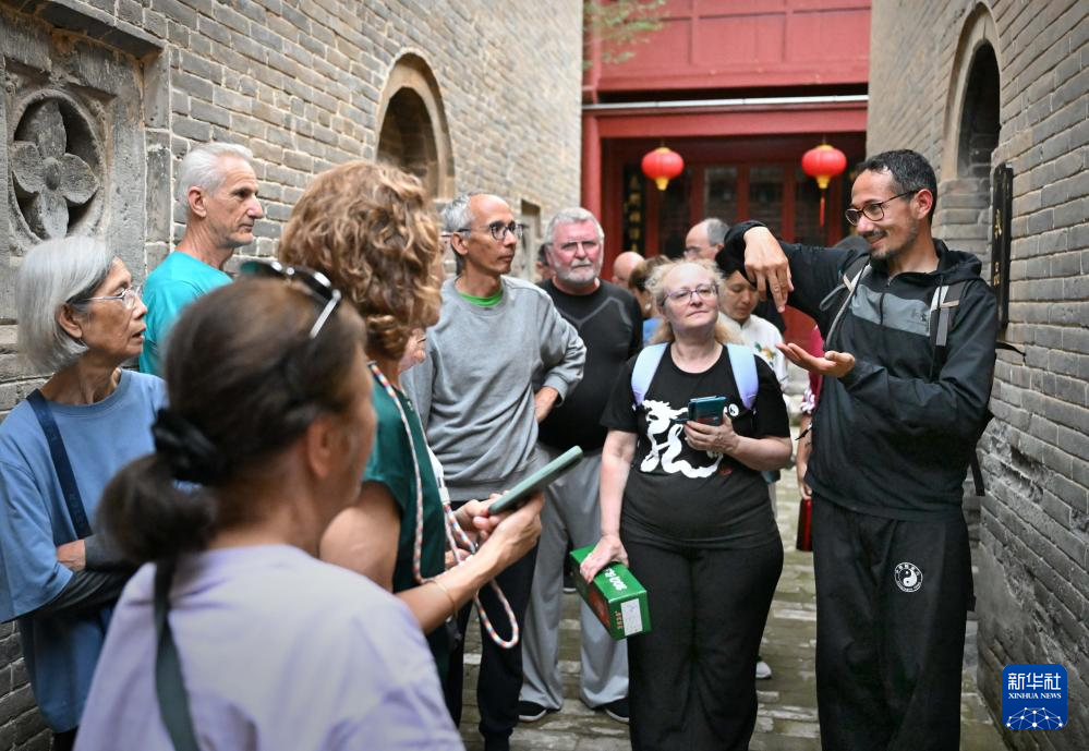 陳少拳(右一)帶領法國學員陳家溝楊露禪學拳處參觀(2024年4月18日攝)。 新華社記者 李安 攝