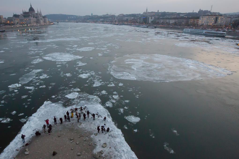 2017年1月9日,在布達佩斯,攝影師在瑪爾吉特島拍攝多瑙河上的浮冰。