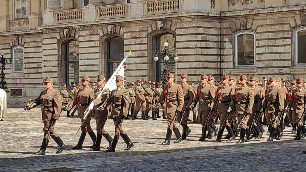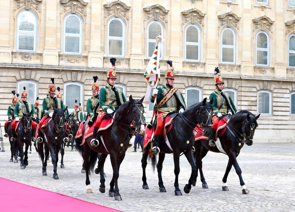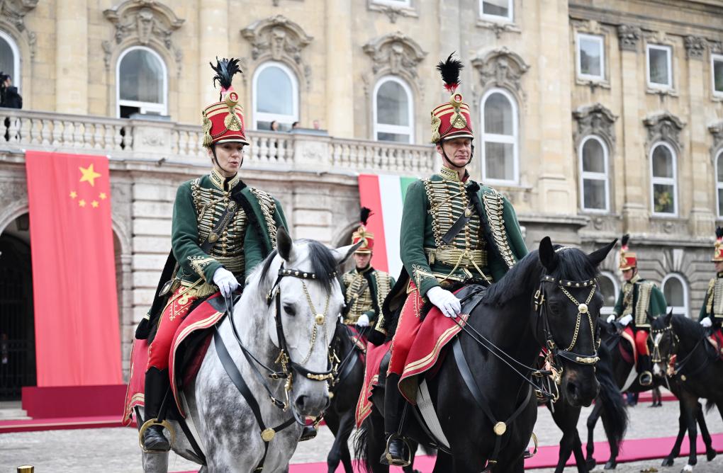 當地時間5月9日上午,國家主席習近平在布達佩斯出席匈牙利總統舒尤克和總理歐爾班共同舉行的隆重歡迎儀式。習近平在舒尤克陪同下檢閱國防軍儀仗隊和騎兵儀仗隊。
