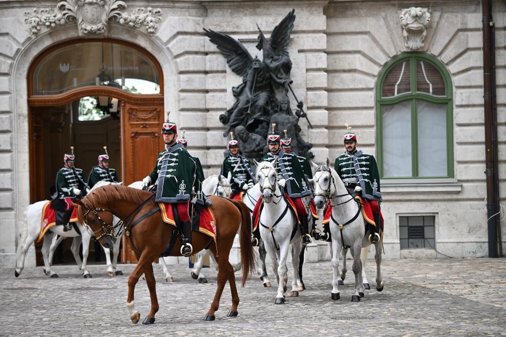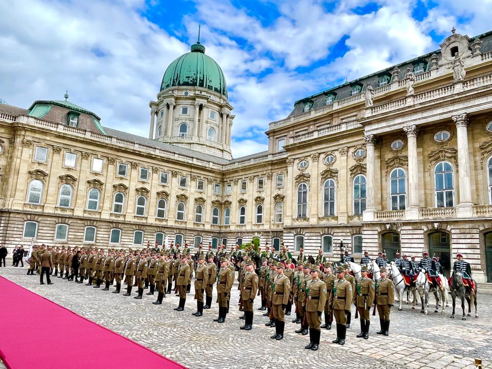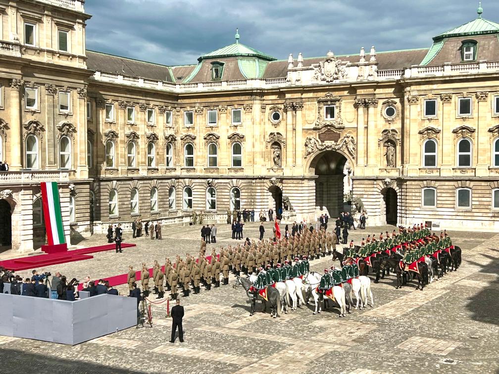 初夏時節的布達佩斯陽光明媚,古老宏偉的布達王宮莊嚴矗立,中匈兩國國旗相映成輝。習近平和夫人彭麗媛乘坐的國賓車隊在匈牙利禮賓馬隊護衛下緩緩駛入布達王宮內庭。舒尤克總統夫婦和歐爾班總理夫婦熱情迎接。