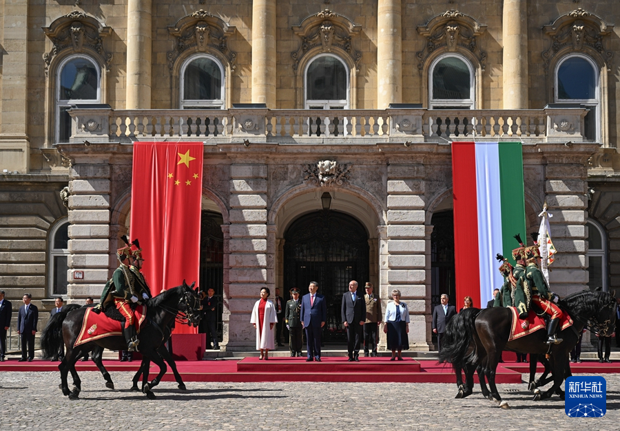當地時間5月9日上午,國家主席習近平在布達佩斯出席匈牙利總統舒尤克和總理歐爾班共同舉行的隆重歡迎儀式。