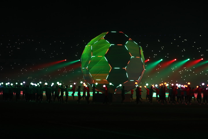 這是3月8日拍攝的的黎波里國際體育場開幕式上的燈光秀表演。新華社發(哈姆扎·圖爾基亞攝)