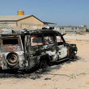 這是2023年8月16日在利比亞的黎波里拍攝的一輛在艾因扎拉區沖突中被燒毀的車輛。新華社發(哈姆扎·圖爾基亞攝)