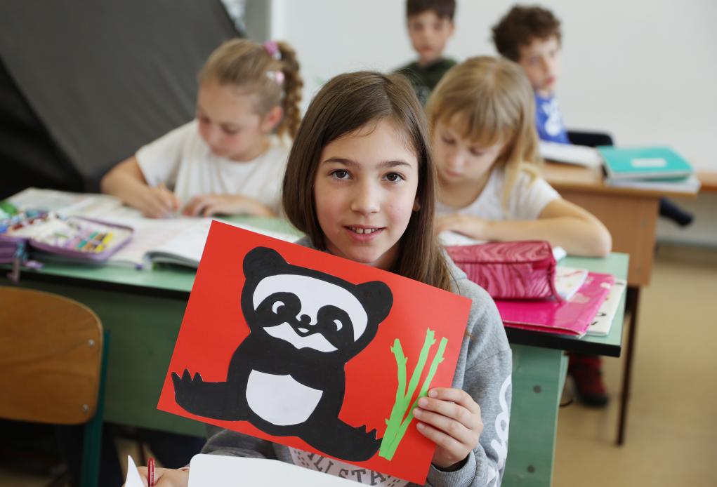 2024年5月3日,在匈牙利布達佩斯,匈中雙語學校三年級學生寶怡展示自己的大熊貓形象美術作品。(新華社記者趙丁喆攝)