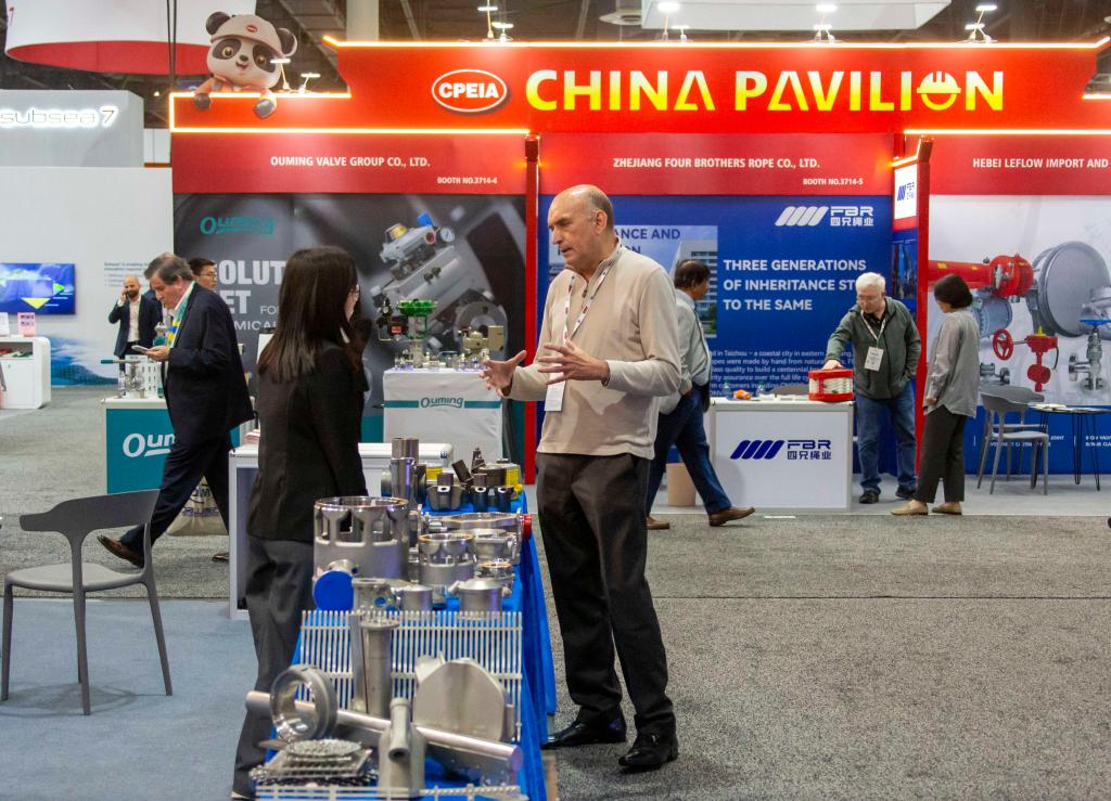 5月6日,參展者在美國休斯敦舉行的國際海洋油氣技術大會及設備展上交談。新華社發(勞承躍攝)