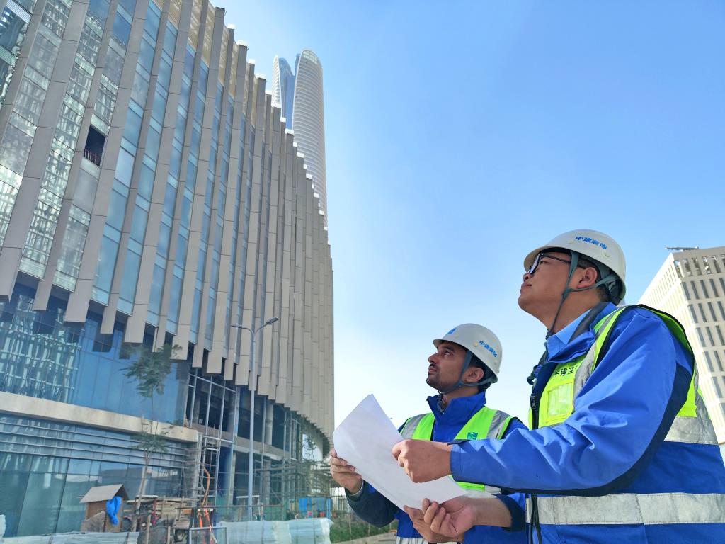 2023年11月27日,中建深圳裝飾有限公司項目經理徐笑笑(右)與來自埃及的幕墻工程師艾哈邁德·賽義德在埃及開羅以東的埃及新行政首都中央商務區施工現場一同查看幕墻安裝進度(手機拍攝)。新華社發(中建深圳裝飾有限公司供圖)