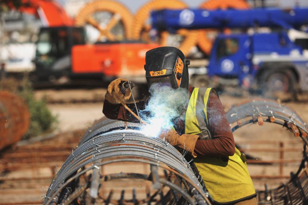 3月2日,一名中方員工在伊拉克巴格達尼蘇爾立體交通樞紐項目現場施工作業。新華社發(哈利勒·達伍德攝)