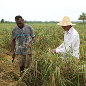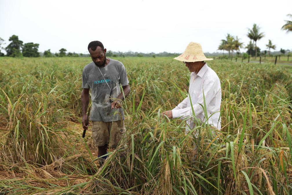 3月13日,在太平洋島國斐濟瑙索里鎮,中國專家(右)在中國援斐濟農業發展技術水稻項目試驗示范培訓基地查看暴雨過后水稻倒伏情況。新華社發(桑欽龍攝)