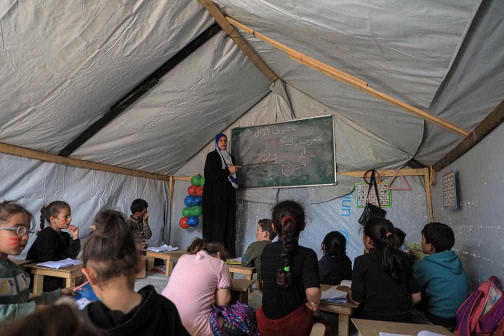 3月27日,在加沙地帶南部城市拉法,一名教師在臨時搭建的教室內為學生授課。新華社發(里澤克·阿卜杜勒賈瓦德 攝)